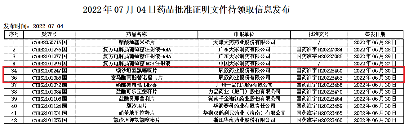 6月30日,辰欣药业按照新4类申报的缬沙坦氢氯噻嗪片和富马酸丙酚替诺福韦片获国家药监局批准上市,视同通过一致性评价。