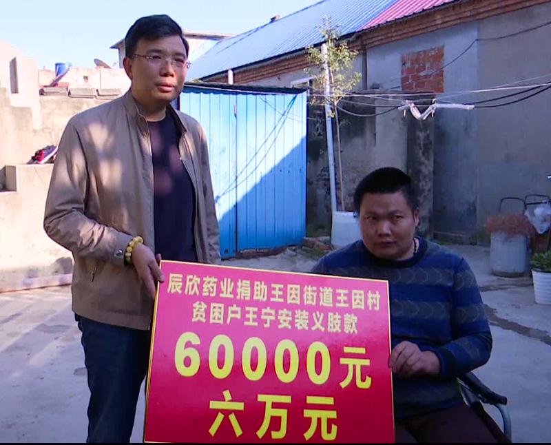 2018年10月16日,辰欣药业综合部部长李峰受董事长杜振新的委托,在王因街道居委会刘梅主任的陪同下前往了王宁家中,为王宁一家送去安装双义肢及康复训练的爱心捐助金60000元,为这一家人送去了对美好生活的憧憬。